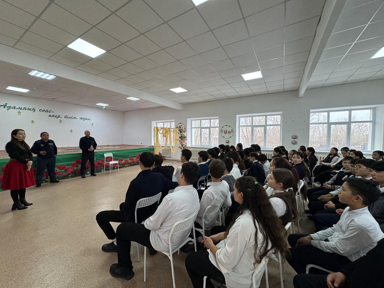 «Заң және Тәртіп» идеологемасын ілгерілету жөнінде және құқықбұзушылықтың алдын алу мақсаттарында «Полиция және балалар – бірге қауіпсіздік үшін» тақырыбында дәріс сабақтары өтілді. Дәрісті мүдделі мемлекеттік органдар қызметкерлері өткізді.